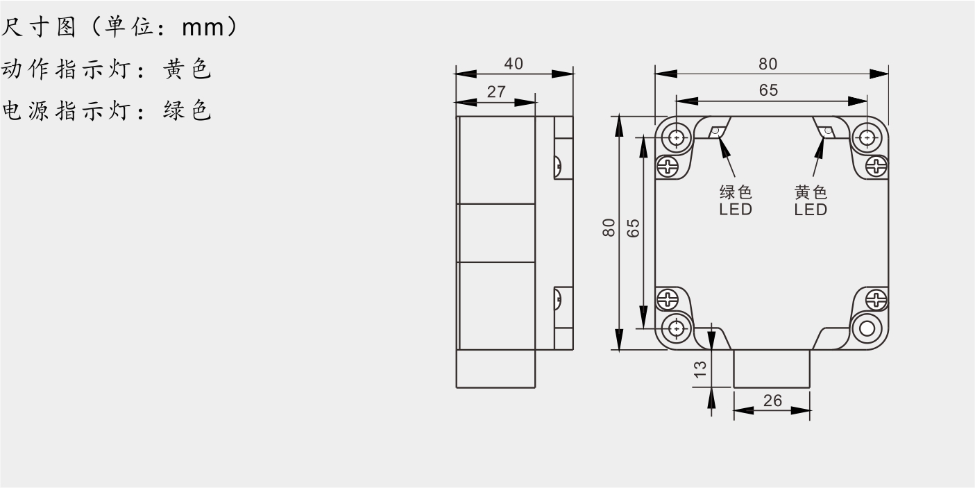 | 开关状态显示LED | 动作指示灯(黄色);电源指示灯(绿色) |